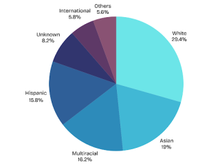 According to Niche, Archbishop Riordan High School has a diverse student body, with approximately 29.4% White, 19% Asian, 16.2% Multiracial, 15.8% Hispanic, 8.2% Unknown, 5.8% International, while the remaining 5.6% are others such as African American and Pacific Islander.