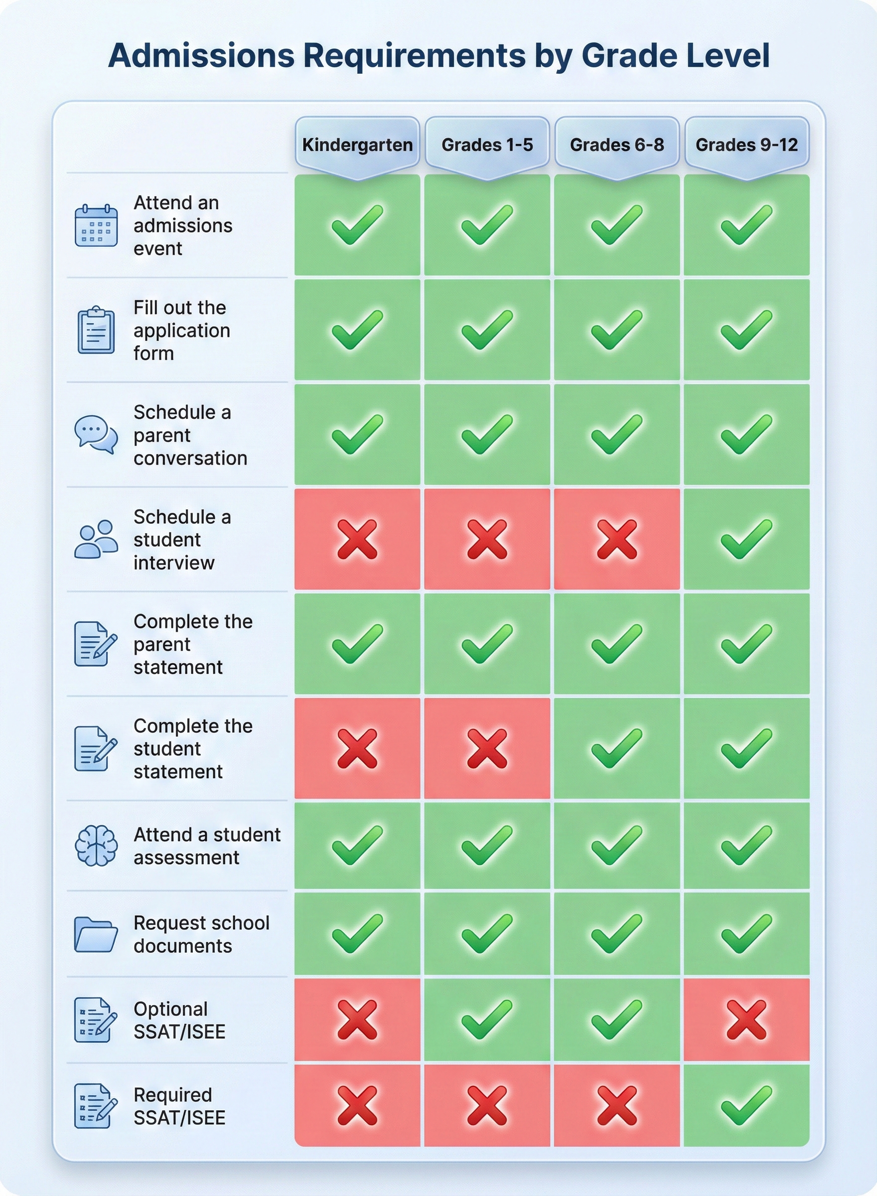 Testing requirements vary by grade level and campus. Interviews, school records, teacher recommendations, and family engagement all factor into decisions. A strong application reflects not only achievement, but fit.