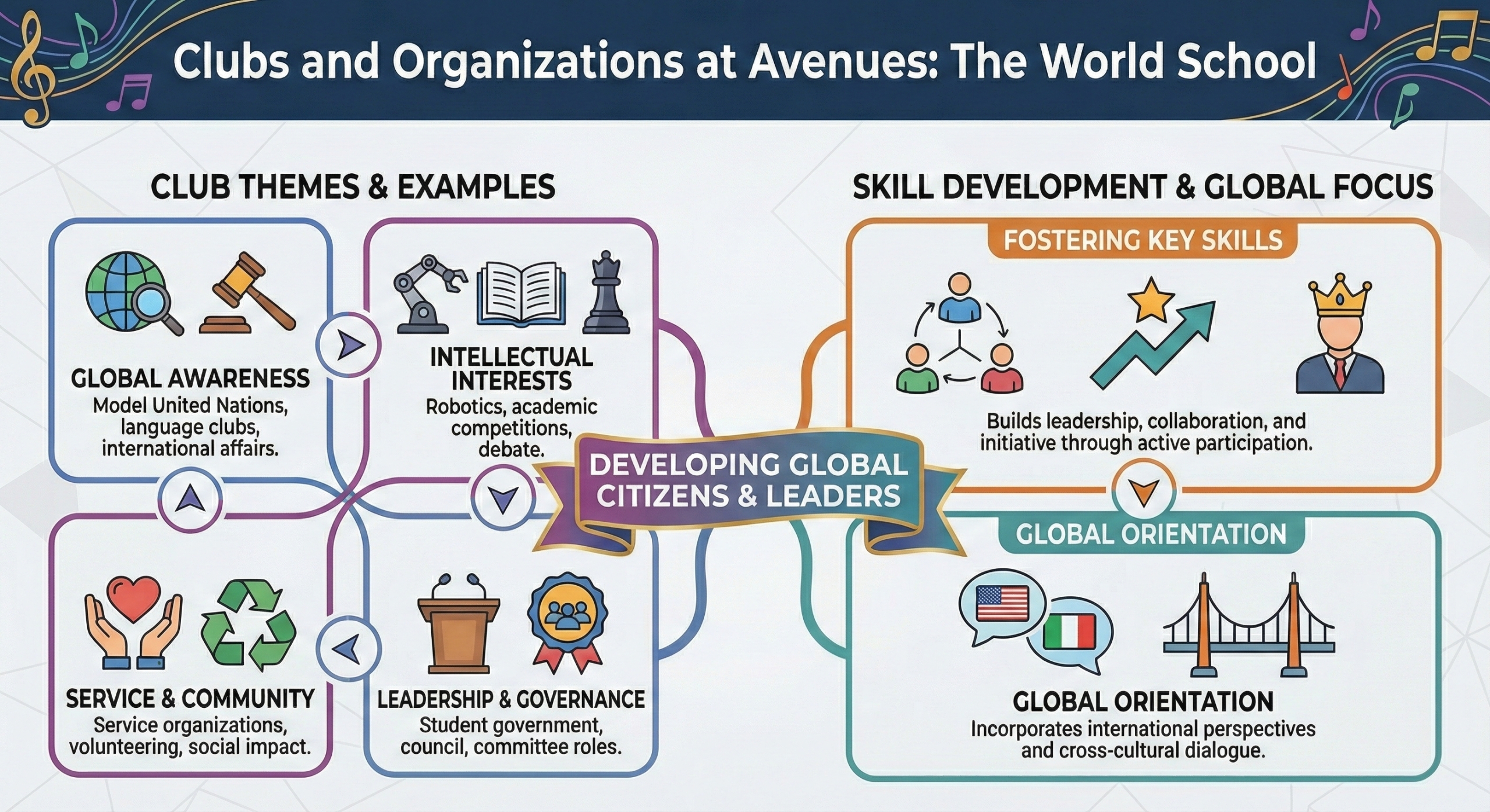 Student organizations often reflect global awareness and intellectual interests. Clubs may include Model United Nations, robotics, language clubs, service organizations, and student government.
