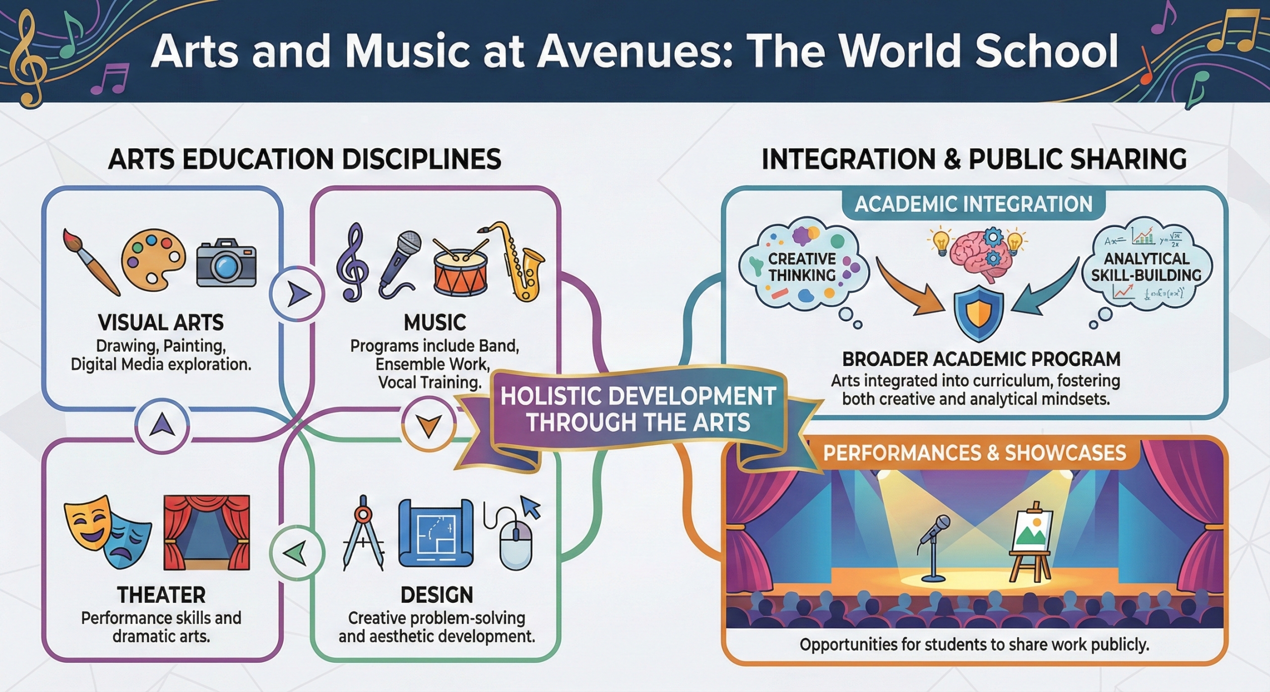 Arts education includes visual arts, music, theater, and design. Students explore drawing, painting, digital media, and performance. Music programs may include band, ensemble work, and vocal training.