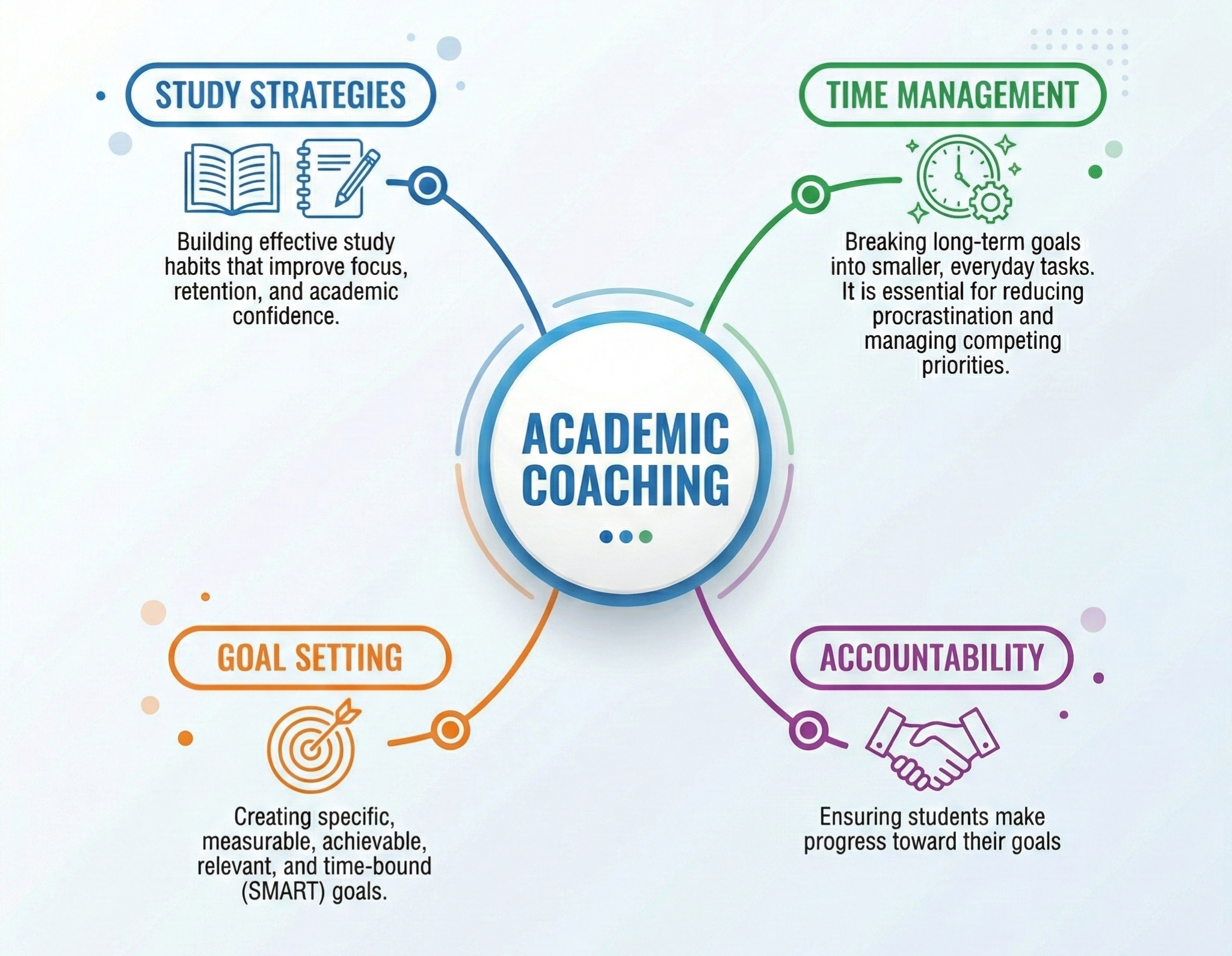 Executive function skills are the foundation of academic success. These include: planning and prioritization, scheduling and calendar management, breaking long assignments into manageable phases, managing multiple deadlines, reducing procrastination, and controlling distractions.
