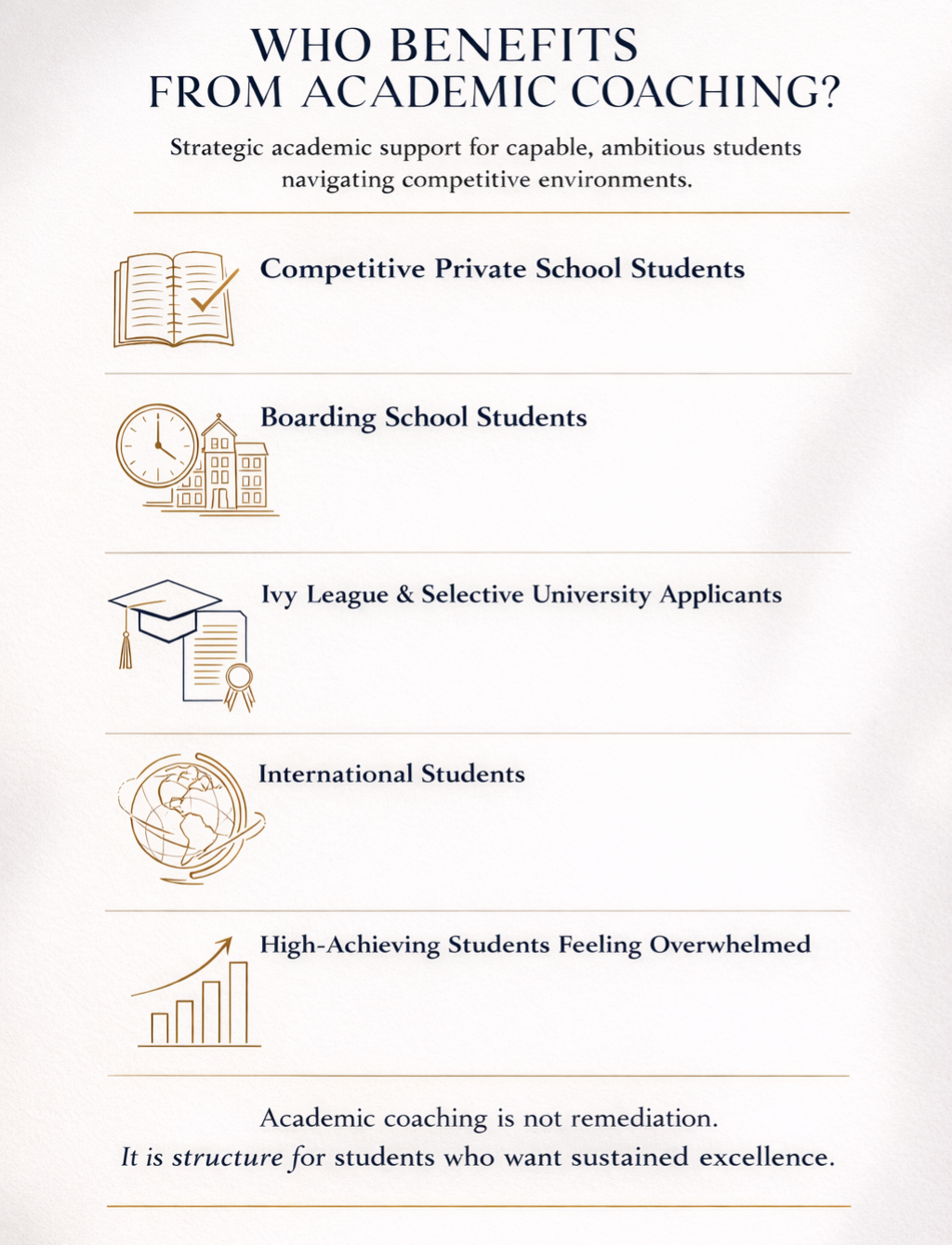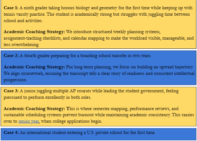 Academic coaching supports boarding school transfers, private school transitions, post-graduate boarding year planning, and college admissions preparation. A student transferring to a boarding school must show they can handle structure and freedom at the same time. A ninth grader stepping into a competitive private school needs systems that will build consistent study habits to sustain academics. A junior juggling AP classes, extracurricular activities, leadership roles, and early college planning should know how to manage their time to meet deadlines and fulfill their responsibilities.